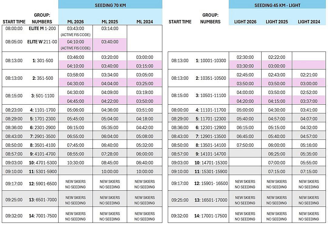 The result at the Marcialonga in the years 2024 and 2025 takes precedence over any other result. Only in the case of a first participation or a result prior to the last two years, placings in other Worldloppet and Ski Classics 2024-2025 races will be taken into account only if indicated on the entry form and according to the criteria established by the Organising Committee as shown in the following SEEDING TABLE.